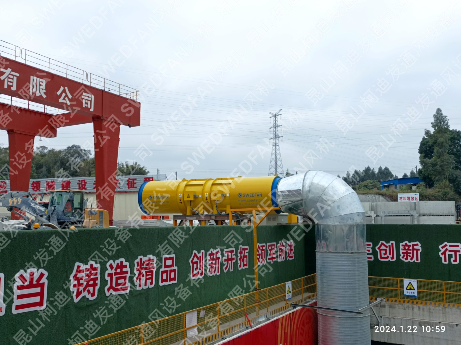2024年的1月22日SWEDFAN 2xAVH-R180.200.4.10风机1台。在中铁隧道局集团有限公司北京分公司承建的广东省江门市珠肇高铁圭峰山隧洞2#竖井项目,完成安装调试,投入运行。为3.8公里总长铁路隧道施工,提供通风保障。