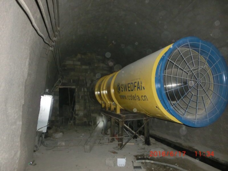 中铁八局承建的秀岭隧道全长17.6公里,单头掘进正洞8.7公里,平导8.9公里。该隧道施工通风采用巷道式通风,正洞进风,平导出风的方式。因前期国产风机在施工至三公里处,通风效果非常差,无法满足施工作业需求,改用斯维德风机。高压轴流风机。型号2xAVH-R125.75.4.8,正洞内安装两个风机站,分别采集新鲜空气送正洞掌子面,平导洞掌子面,在平导洞口前期安装1台斯威德排风机1xAVH-R140.75.4.4。(后期再添加1台)向外排风。隧道断面,正洞50m2,平导20m2,风管直径1300mm(其中平导内900mm)。风机于2016年6月18日启动调试完毕