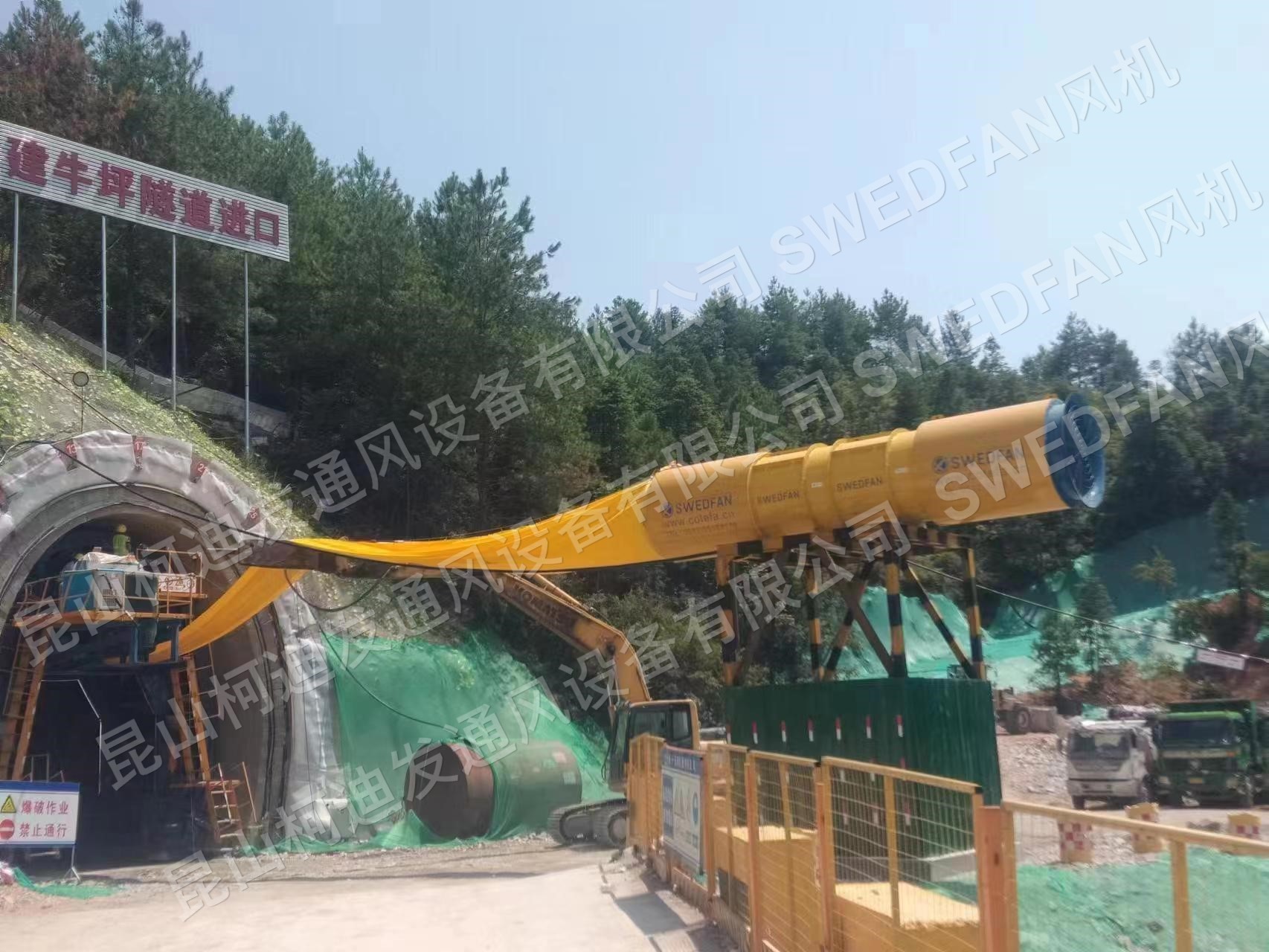 SWEDFAN 2xAVH-R140.132.4.8风机。在中铁十五局承建的瑞梅铁路(江西段)RMJ-4标三百山隧道出口平导洞口,完成安装调试,即将投入运行。为4000米的平导洞施工,提供通风保障。